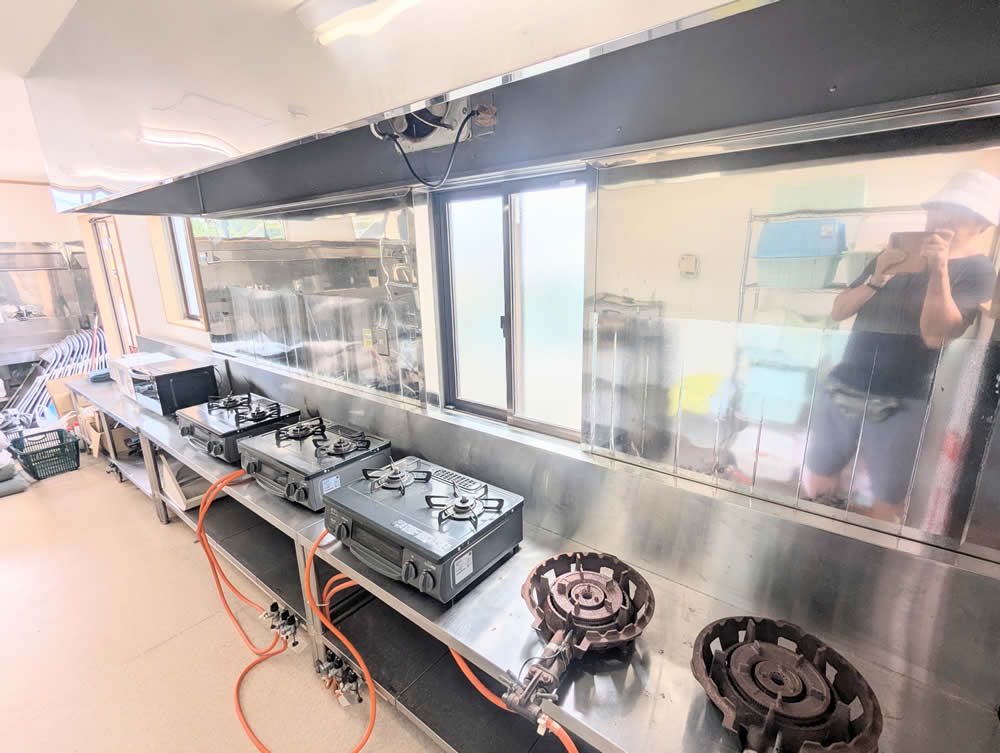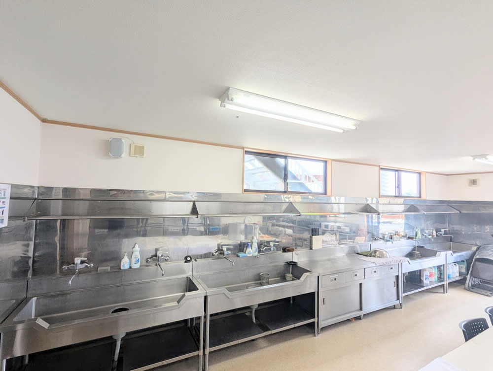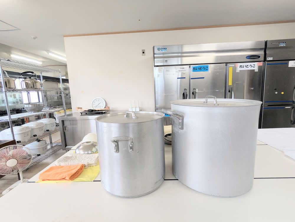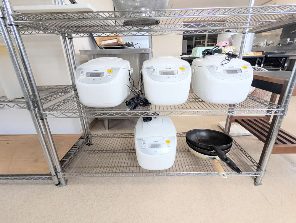調理器具は揃っておりますので、調理場にて自炊していただくことができます。調理器具、什器類、大型業務用冷蔵庫(ホシザキ)、電子レンジ、炊飯器3、etc...